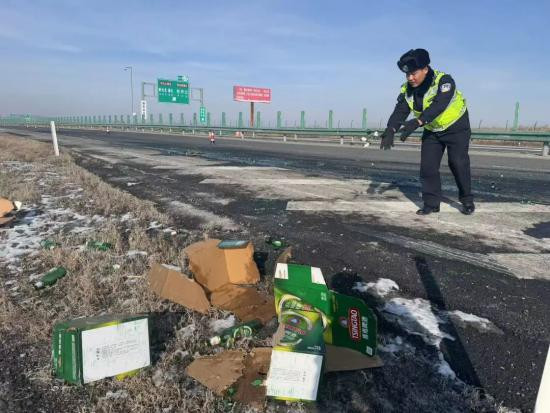 到达地点后,民警发现现场一片狼藉,路面上全是玻璃瓶碎渣,并且布满了行车道和应急车道,只剩下超车道能通行,空气中也散发着强烈的啤酒味。为保障交通安全,民警迅速组织警力放置安全防护装置做好警示,同时引导车辆从超车道缓慢通行,并徒手开展大件散落物清理工作。在保证其他车辆可以正常通行后,民警便向当事人了解了具体情况。