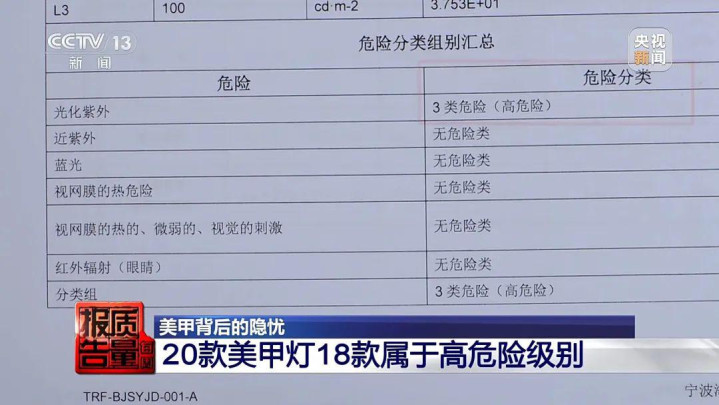 更为严重的是,20款美甲灯均存在紫外光源安全风险,其中18款样品工作时紫外光源对皮肤及眼睛的危险级别达到3类风险,高危险级别,两款为中度危险级别。